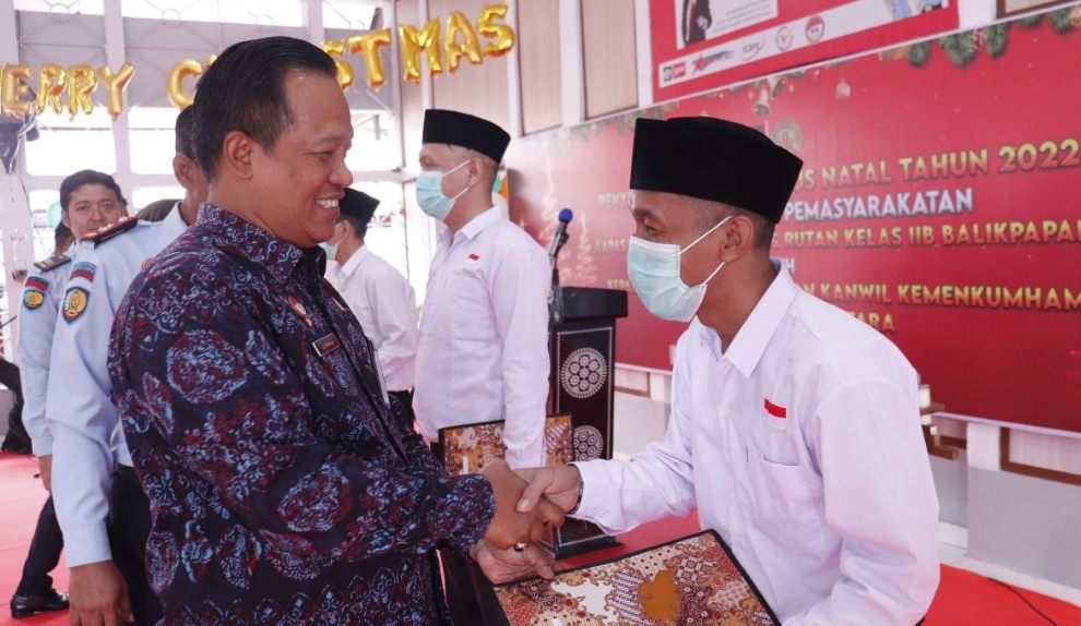 Pemberian remisi diserahkan oleh Kepala Divisi Pemasyarakatan Kalimantan Timur Jumadi kepada Warga Binaan Rutan Balikpapan yang dilaksanakan di Aula Utama Minggu (25/12/2022).