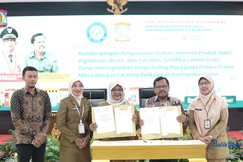 BALIKPAPAN, kaltimonline.com – Dinas Kesehatan (Dinkes) Kota Balikpapan dan Pusat Halal Universitas Airlangga (Unair) tanda tangani nota kesepahaman atau Memorandum of Understanding (MoU) pendampingan sertifikasi halal untuk Usaha Kecil Mikro dan Menengah (UMKM) di Balikpapan, Selasa (24/9/2024) di Aula Balaikota Balikpapan.
