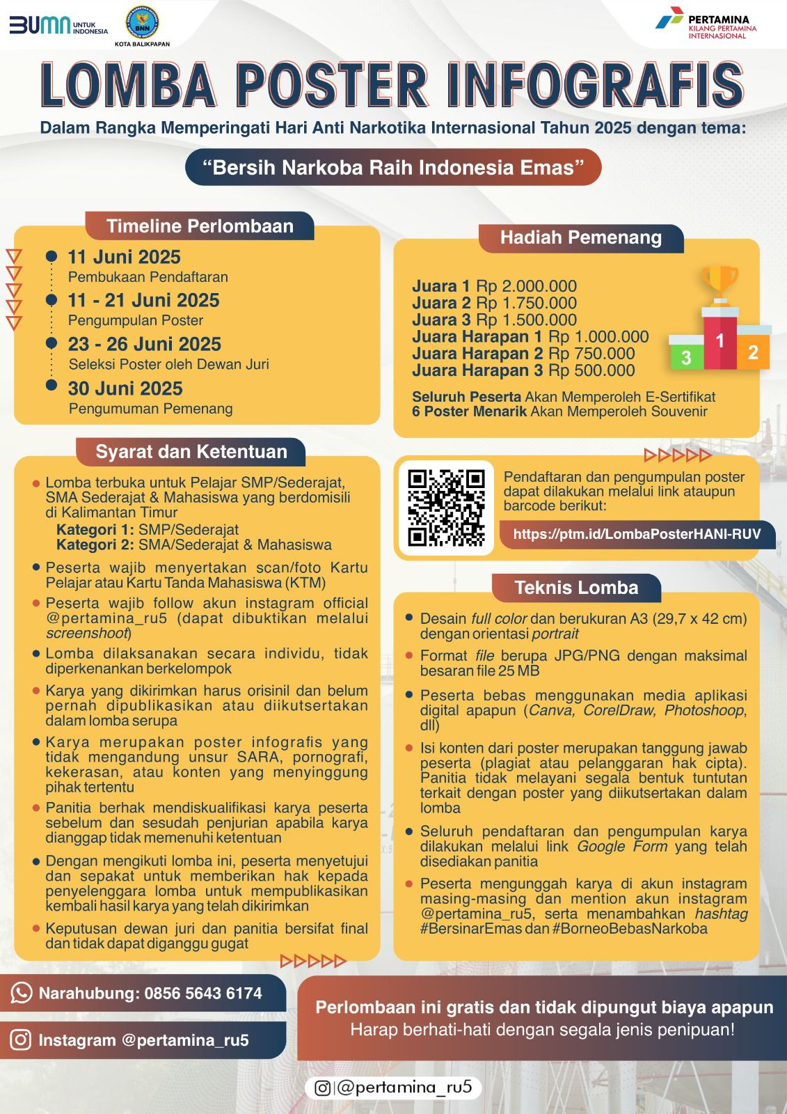 BALIKPAPAN – PT Kilang Pertamina Internasional (KPI) Unit Balikpapan berkolaborasi dengan Badan Narkotika Nasional (BNN) Kota Balikpapan menggelar lomba poster infografis bertema “Bersih Narkoba Raih Indonesia Emas (Bersinar Emas)”. Lomba poster ini bertujuan meningkatkan kesadaran remaja tentang bahaya narkotika dan menyalurkan kreativitas, dengan total hadiah 15 juta rupiah. Kegiatan ini diperuntukkan bagi pelajar tingkat Sekolah Menengah Pertama (SMP), Sekolah Menengah Atas (SMA)/sederajat, hingga mahasiswa di wilayah Kalimantan Timur.
