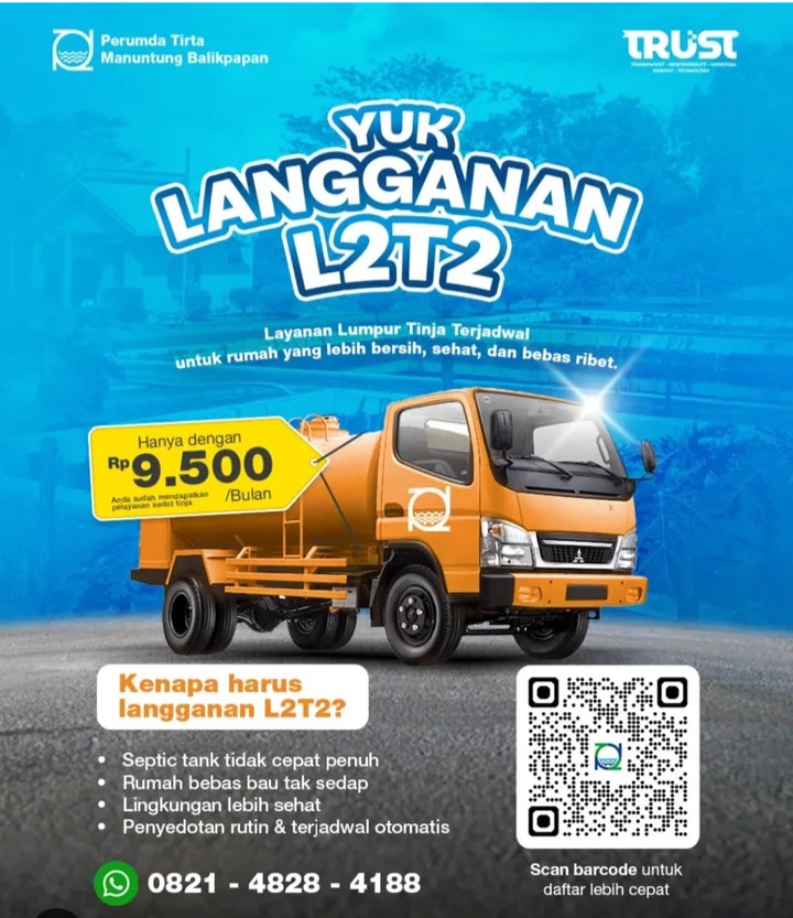 BALIKPAPAN-Perumda Tirta Manuntung Balikpapan (PTMB) terus memperkuat komitmennya dalam menyediakan layanan sanitasi yang aman dan berkualitas bagi masyarakat. Salah satu upaya yang kini semakin digencarkan adalah Program Layanan Lumpur Tinja Terjadwal (L2T2), sebuah inovasi pelayanan yang memastikan septic tank warga berfungsi optimal dan membantu menjaga kebersihan lingkungan permukiman.