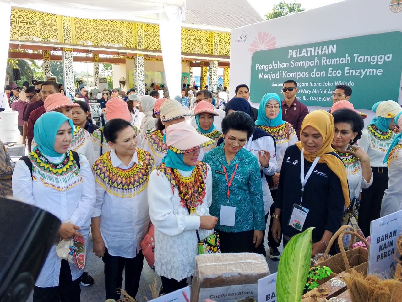PENAJAM PASER UTARA, kaltimonline.com— Iriana Joko Widodo bersama Wury Maruf Amin dan para anggota Organisasi Aksi Solidaritas Era Kabinet Indonesia Maju (OASE KIM) hari ini mengunjungi booth Pertamina Group dalam rangkaian acara pelatihan pengelolaan sampah rumah tangga di Kabupaten Penajam Paser Utara. Kunjungan ini menyoroti komitmen Pertamina Group dalam inovasi dan pengelolaan lingkungan melalui berbagai produk daur ulang.
