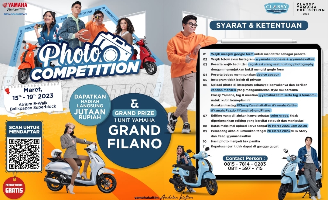 “Khusus kalian semua yang suka dan cinta banget dengan dunia photography, pas banget deh ekspresikan diri kalian dengan ikutan Classy Yamaha Photo Competition di Yamaha Exhibition,” Kata Asisten Manajer PT. STSJ Main Dealer Yamaha Kaltim, Efendy Ariadi.