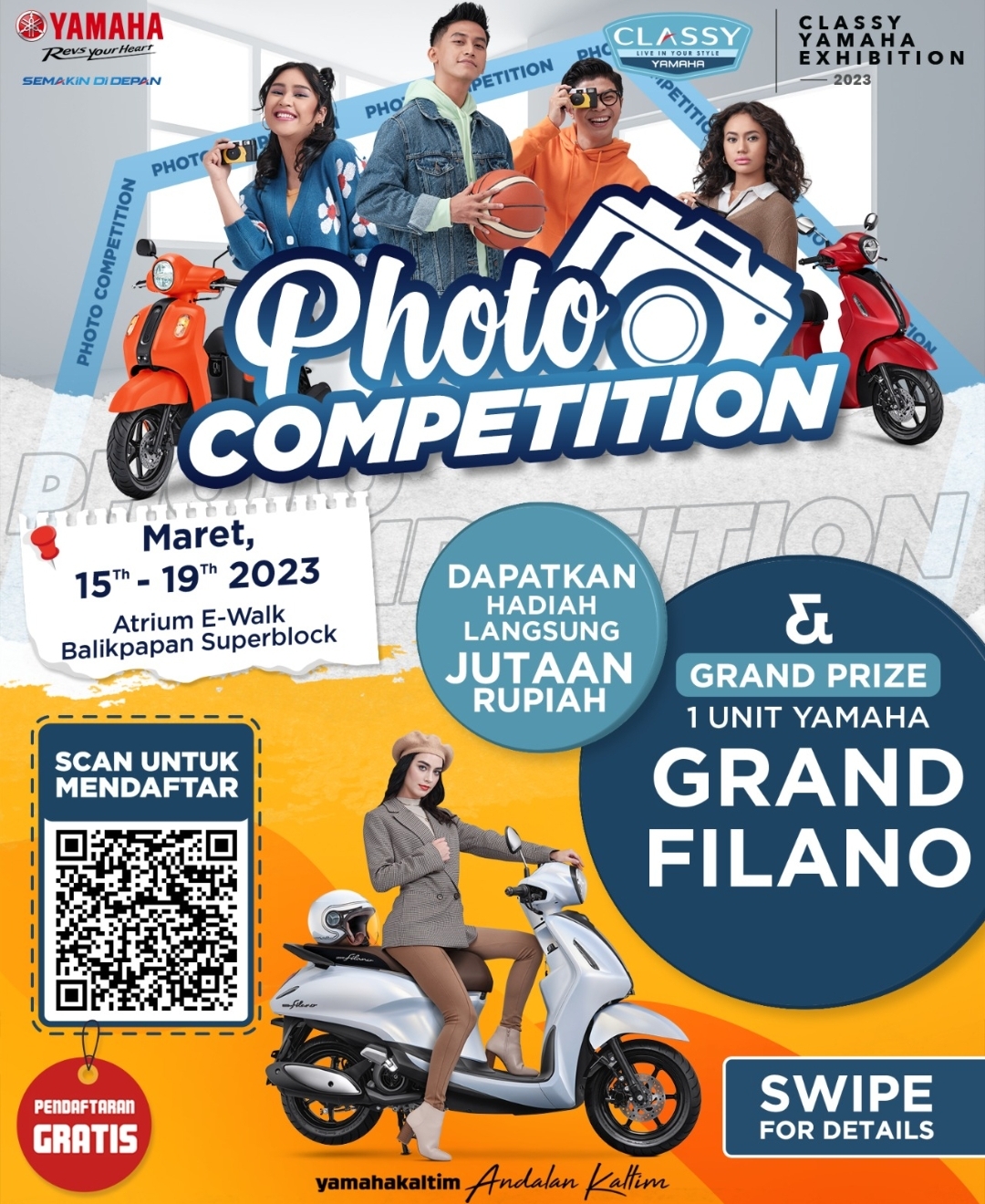 Kegiatan yang akan berlangsung di Atrium e-Walk, Balikpapan Superblock (BSB) pada 15-19 Maret 2023 ini dibuka gratis oleh Yamaha Kaltim. Pendafataran gratis melalui barcode yang tersedia.